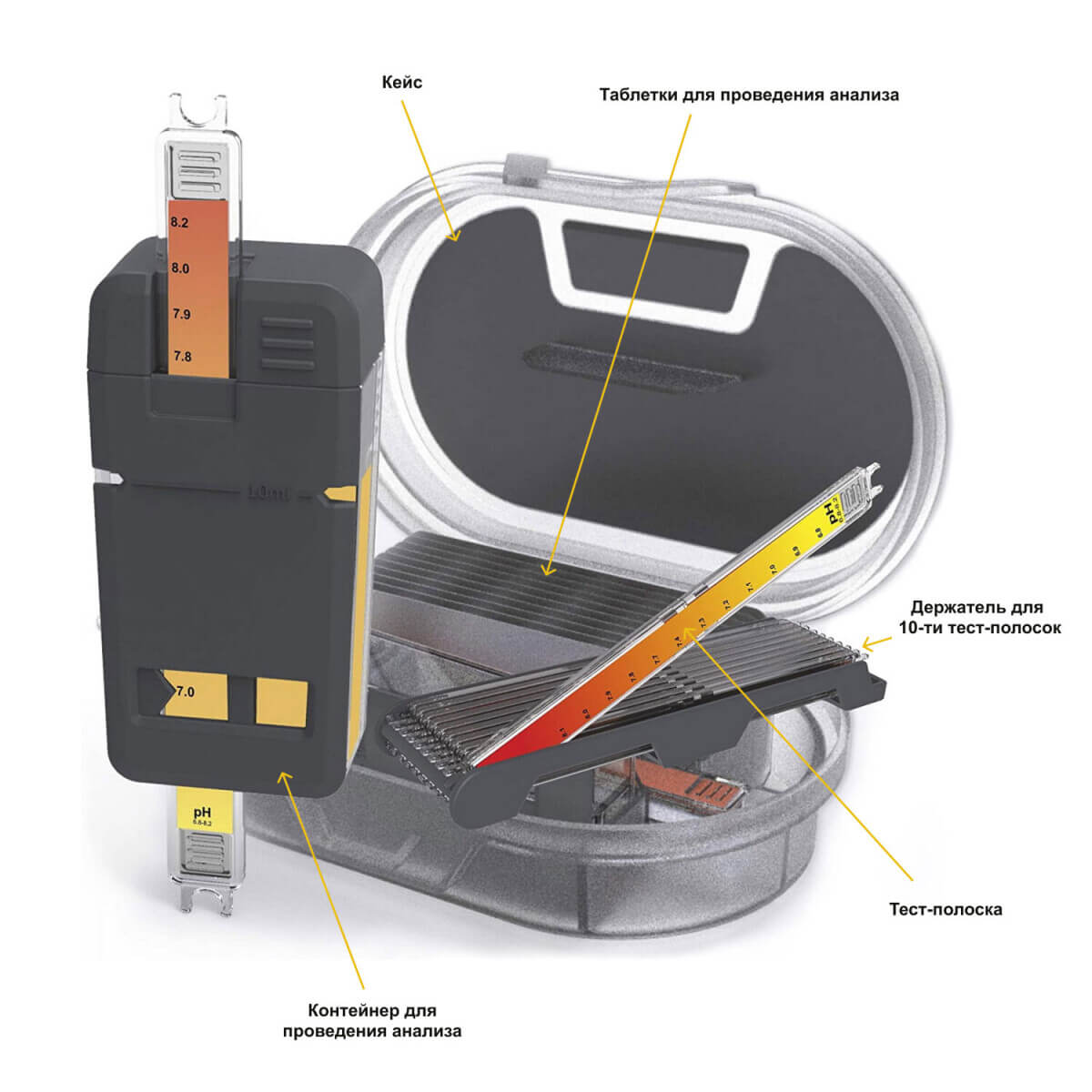 В кюветы набираем воду, кладем таблетки, взбалтываем и сравниваем. Плюсы: более точный тест, белая стенка в кюветах.