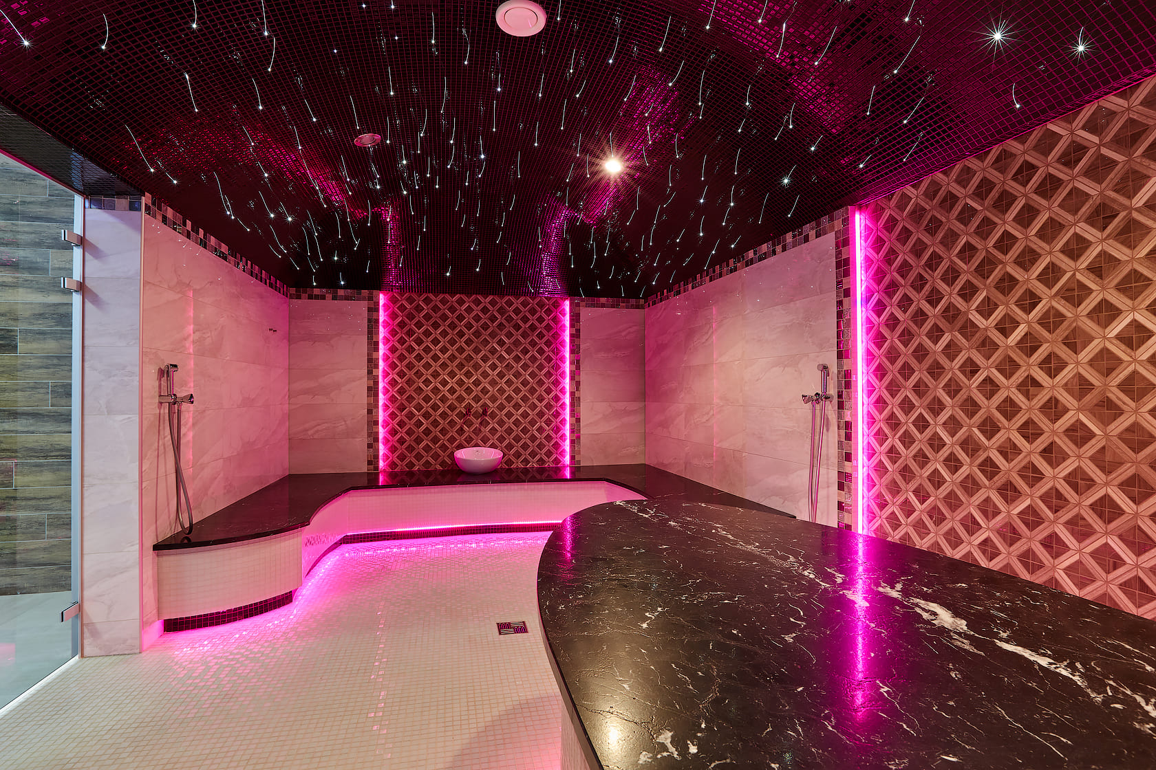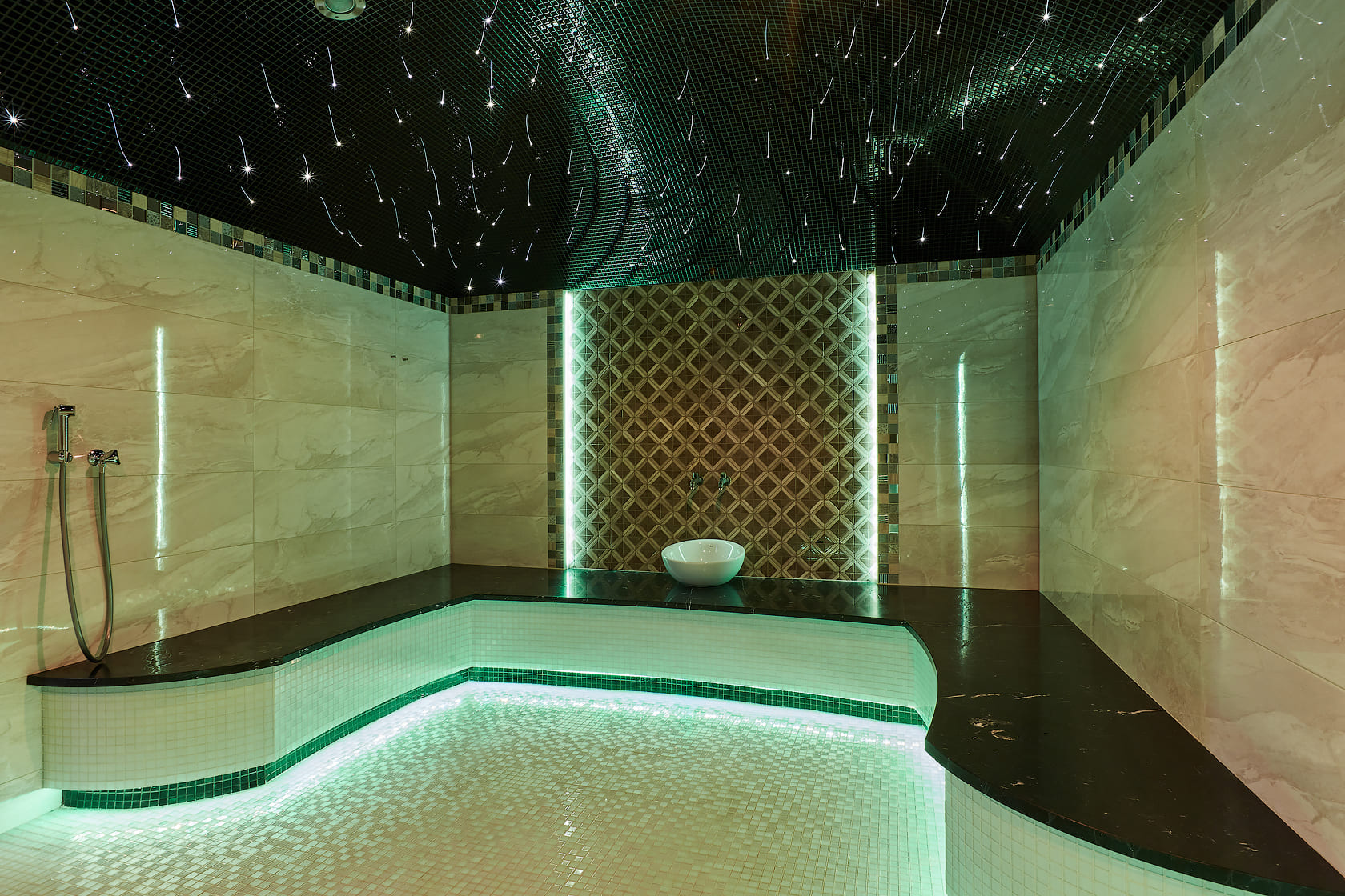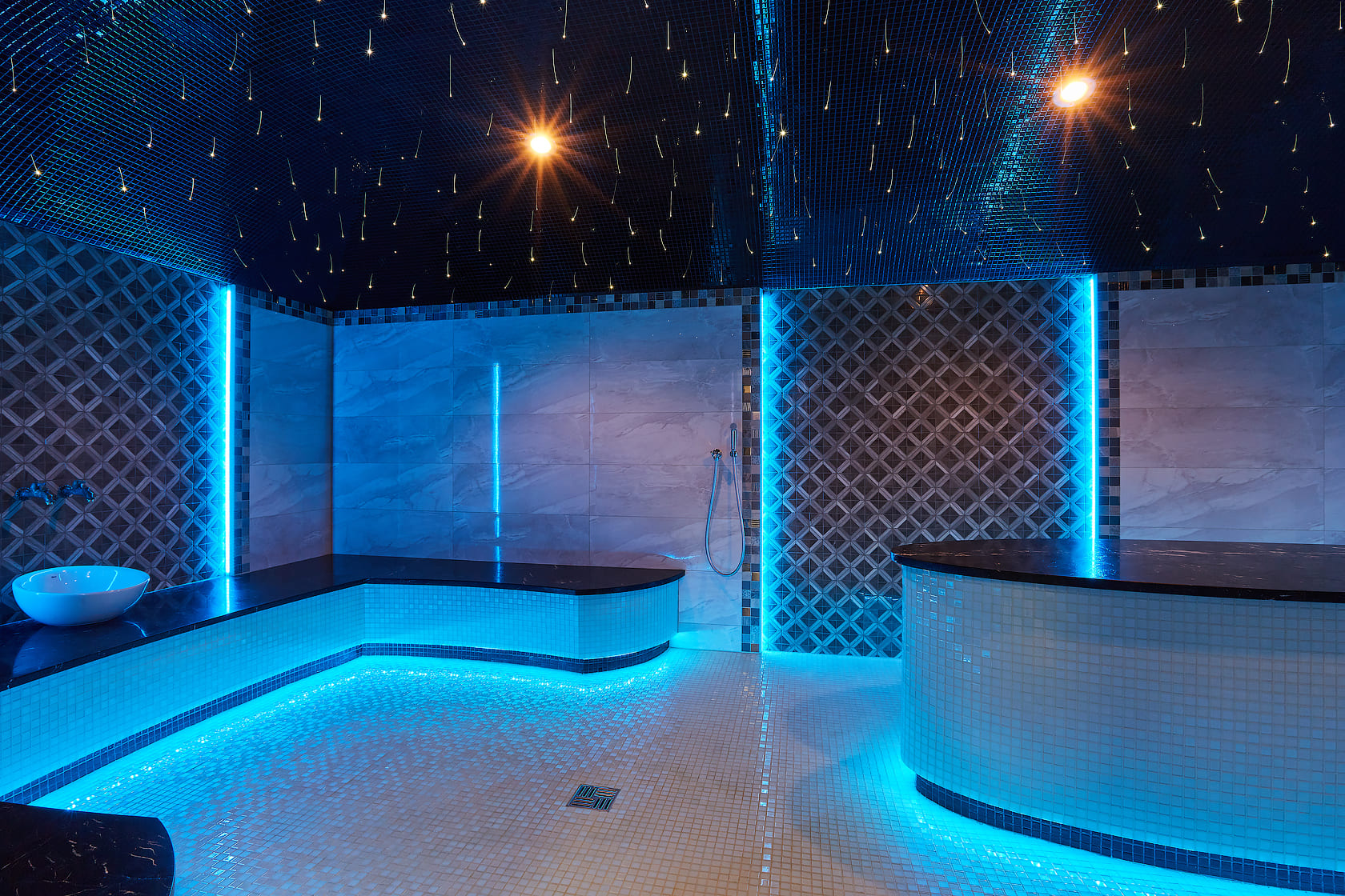 Главное отличие — в микроклимате: в сауне поддерживается высокая температура при низкой влажности, а в хаммаме — мягкое тепло при 100% влажности. Также они различаются материалами: сауна чаще всего отделывается деревом, а хаммам — камнем, плиткой или мозаикой.