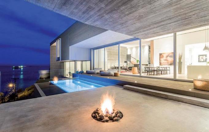 Наличие одного или нескольких элементов с настоящим огнем добавит атмосферы и тепла любому бассейну. В зависимости от того, какого эффекта вы хотите добиться, можно организовать небольшой участок с огнем в углублении обходной дорожки, это может быть современный биокамин или несколько чаш, расположенных на разных уровнях. Это решение отлично