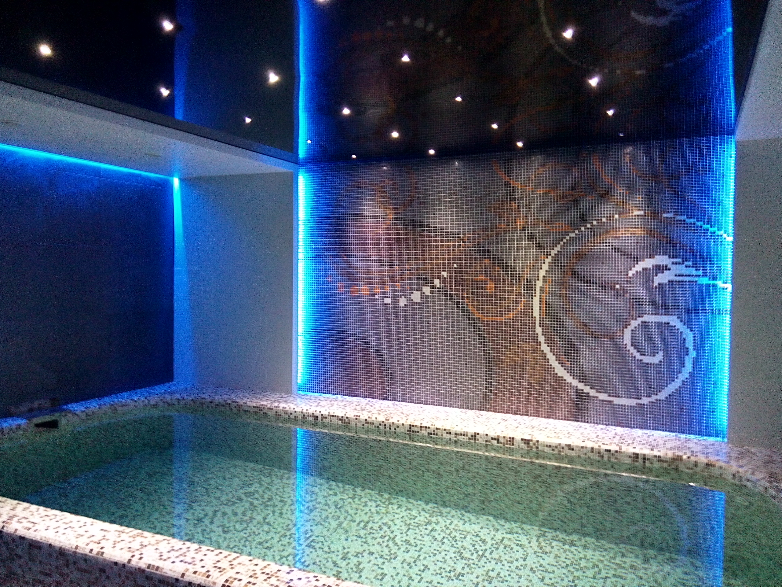 В комплексе спроектированы помещения сауны и хаммама с эффектом соляной комнаты и встроенными форсунками для ароматерапии, установлен массажный стол с подогревом, ледогенератор, дорожка Кнейпа и два раздельных душа.