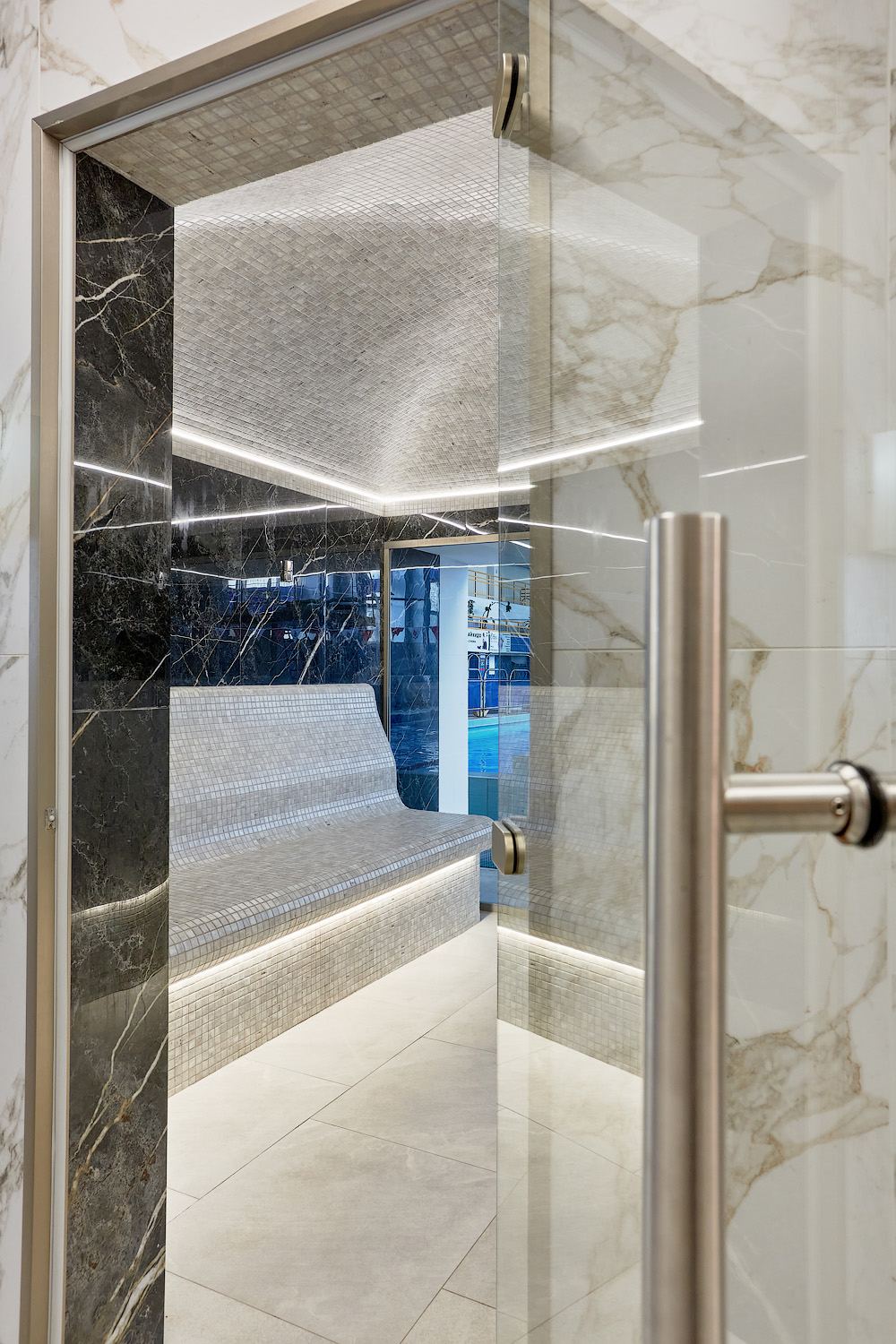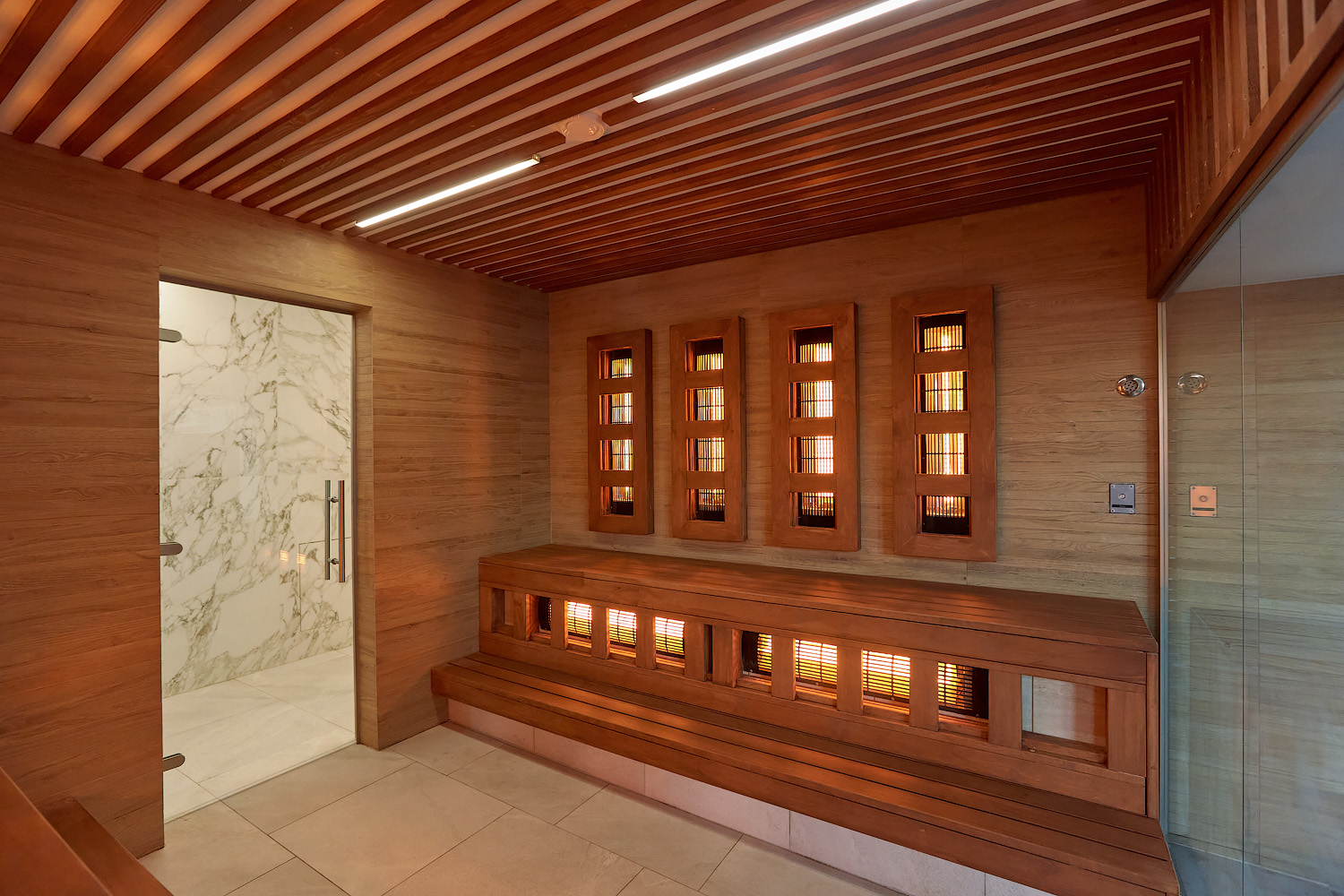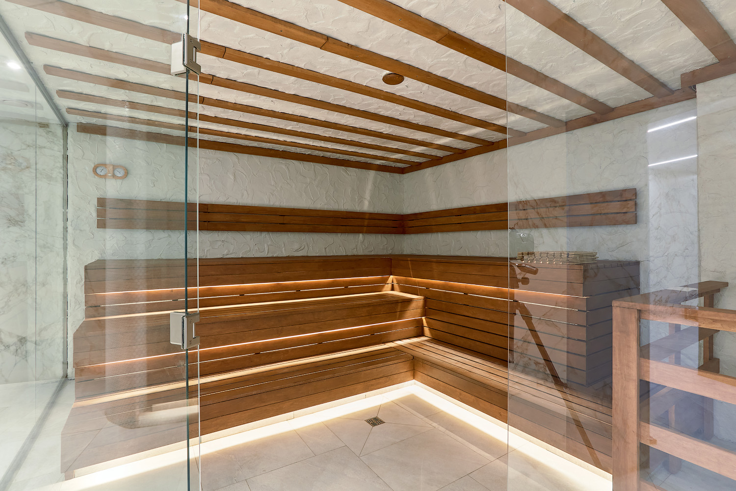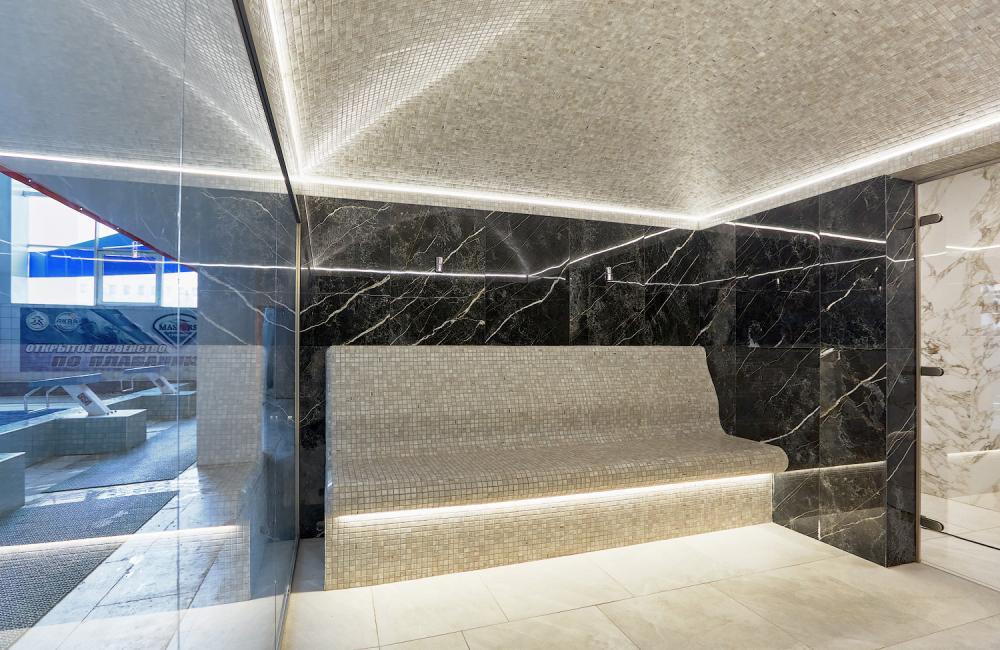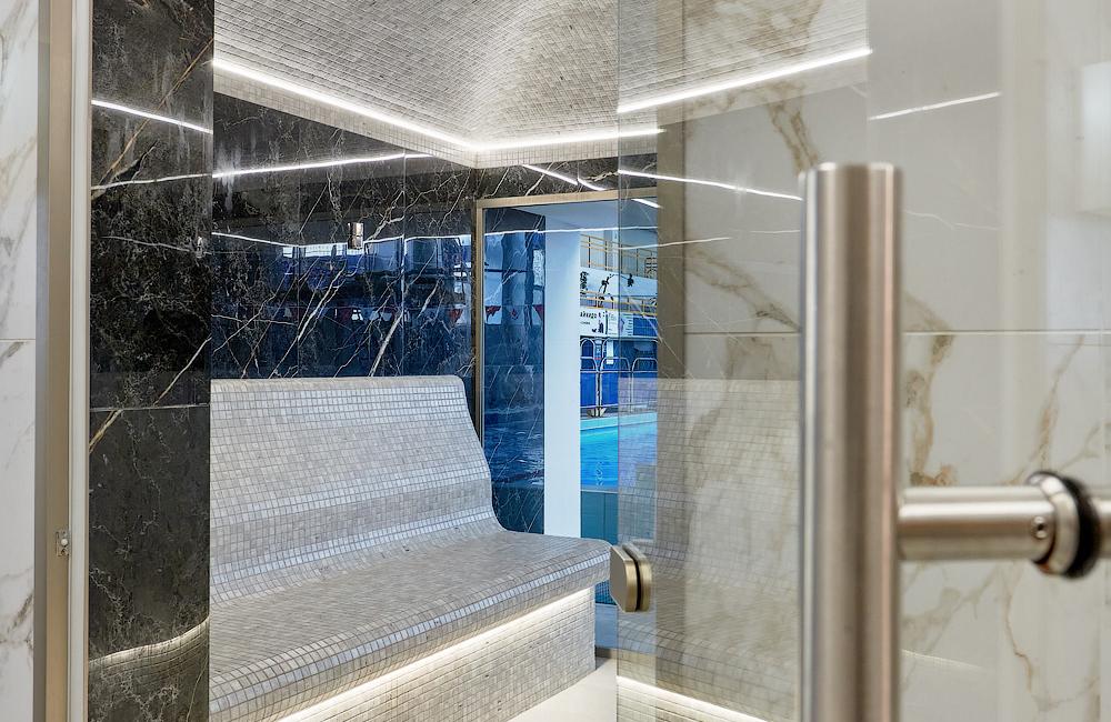 Главное отличие — в микроклимате: в сауне поддерживается высокая температура при низкой влажности, а в хаммаме — мягкое тепло при 100% влажности. Также они различаются материалами: сауна чаще всего отделывается деревом, а хаммам — камнем, плиткой или мозаикой.